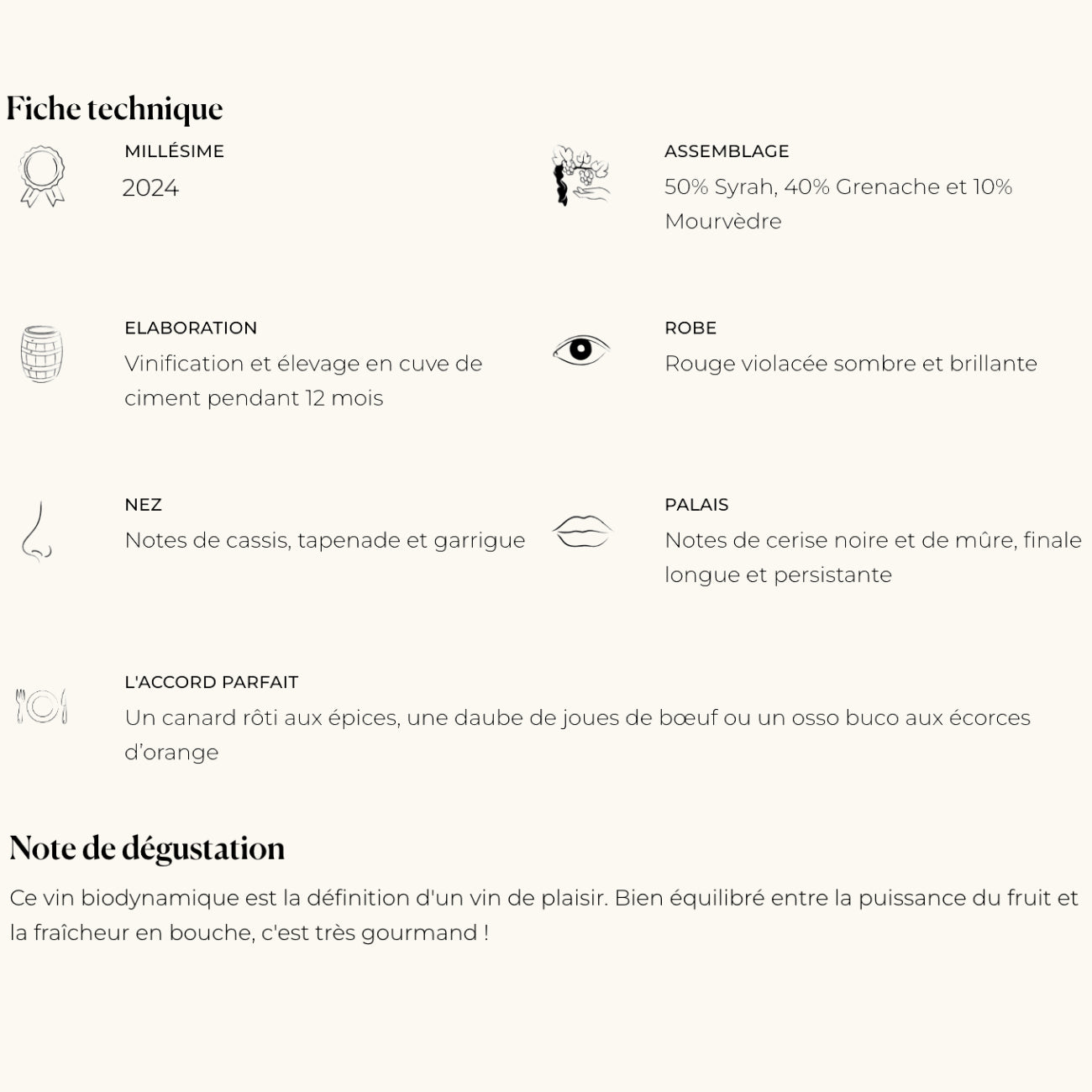 Assemblage : 50% Syrah, 40% Grenache et 10% Mourvèdre